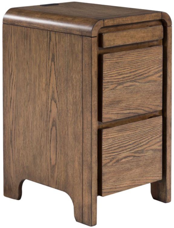 Constructed of solid, veneer and engineered wood in a warm brown finish