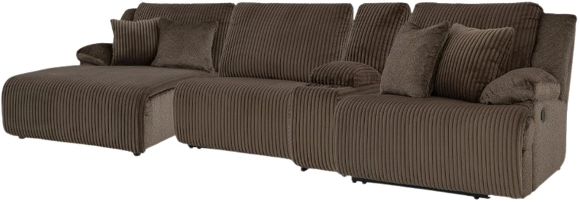Includes 4 Pieces: Left-arm facing press back chaise, armless recliner, console with storage and right-arm facing recliner